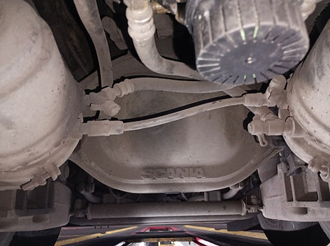 O trólebus Scania / Caio / Weg / Eletra 4 1518 na vala de manutenção - vista em detalhe do diferencial, encanamento e cilindros do freio pneumático do chassi Scania.