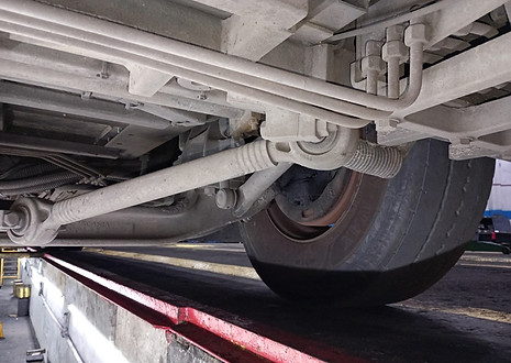 O trólebus Scania / Caio / Weg / Eletra 4 1518 na vala de manutenção - vista de um dos eixos traseiros e conjunto da suspensão pneumática do chassi Scania.