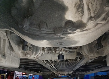 O trólebus Scania / Caio / Weg / Eletra 4 1518 na vala de manutenção - vista em detalhe do acoplamento do eixo cardã ao diferencial.